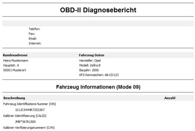 Dokumentation der Fahrzeugdiagnose, zeigt gespeicherte Fehlercodes DTC, Sensorwerte und Betriebszustände an und kann zur Fehlerbehebung oder Fahrzeughistorie genutzt werden.